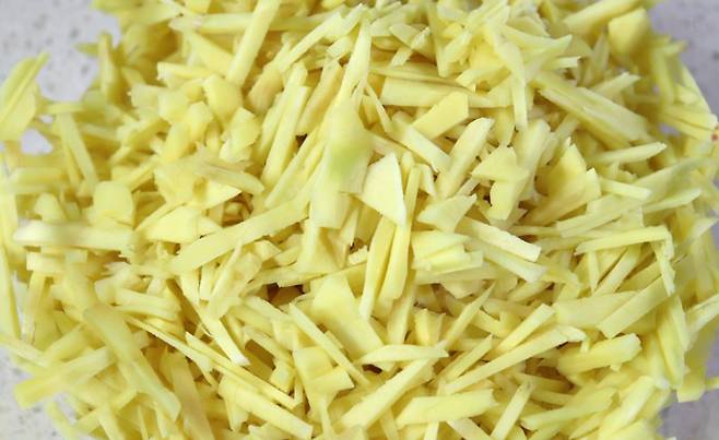 - 생강은 잘 씻어 껍질을 깐 뒤 채썰어 줍니다.