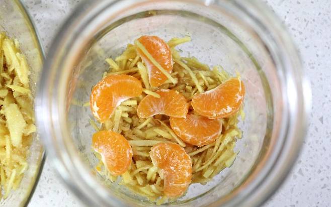 - 유리병에 황설탕을 버무린 생강과 귤 레몬을 차곡차곡 넣어줍니다