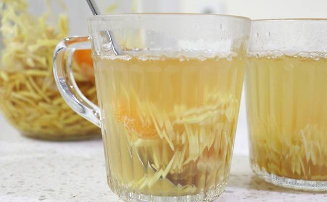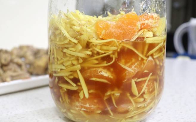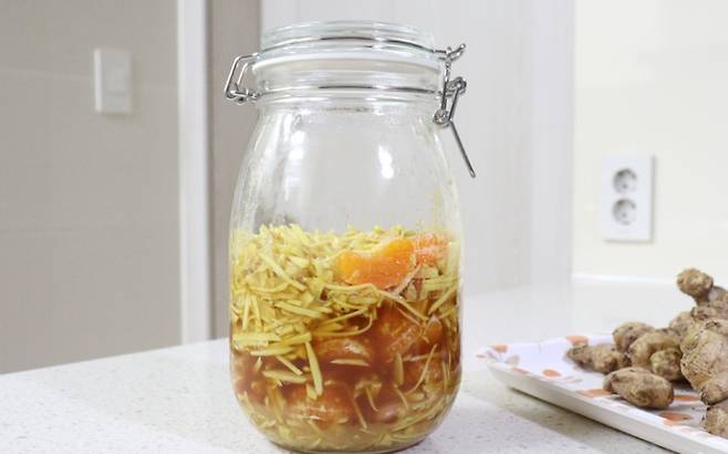 이대로 실온에서 하루 정도 보관했다가 냉장고에 넣어 놓고 따뜻한 물에 타서 마시면 된답니다. 귤과 레몬의 새콤한 맛과 생강의 매콤함이 매력적인 생강청 만들어보세요.