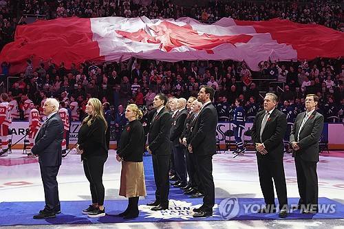 2024 Hockey Hall of Fame inductees Colin Campbell, left to right, Krissy Wendell-Pohl, Natalie Darwitz, Pavel Datsyuk, Shea Weber, Jeremy Roenick and David Poile stand for the national anthems following a pre-game ceremony prior to NHL hockey action between the Detroit Red Wings and Toronto Maple Leafs in Toronto on Friday, November 8, 2024. (Frank Gunn/The Canadian Press via AP) MANDATORY CREDIT