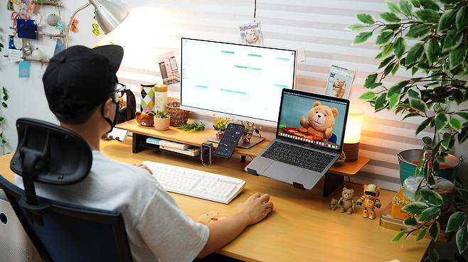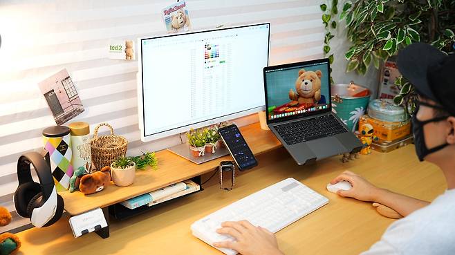 업무상 노트북을 함께 사용해야하는 분들에게 좋을 것 같고 노트북 받침대가 약간의 스위블 기능이 있어서 모니터와 겹치지 않게 각도를 조절해서 배치할 수 있습니다.