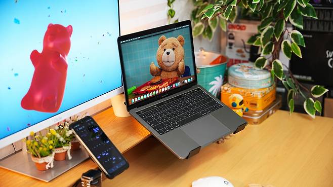 모니터받침대의 양옆까지 활용해서 다양한 기기를 수납할 수 있었고 스마트폰거치대를 아이패드거치대로 활용해 봤습니다.