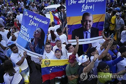 Opposition supporters cheer for presidential candidate Edmundo Gonzalez and opposition leader Maria Corina Machado during a campaign rally in Maracaibo, Venezuela, Tuesday, July 23, 2024. The presidential election is set for July 28. (AP Photo/Matias Delacroix)
