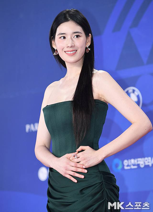 정은채는 고급스러운 다크그린 컬러의 튜브탑 슬림핏 롱드레스를 선택해 심플하면서도 시크한 분위기를 뽐냈습니다.