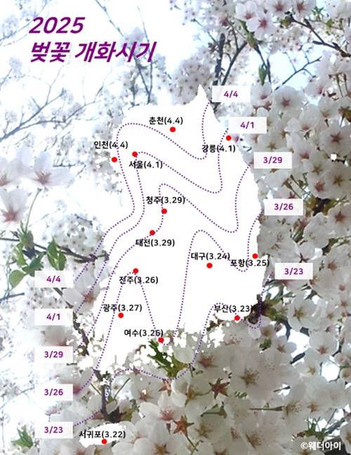 기상 정보 전문 기업 웨더아이가 발표한 '2025년 벚꽃 개화예상시기'에 따르면, 올해 벚꽃 개화시기는 전국적으로 평년보다 3~8일정도 빠르다고 해요.