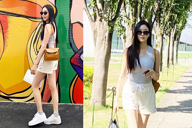 김사랑은 슬리브리스에 짧은 기장의 면팬츠를 입고 시원한 썸머패션을 완성했다.