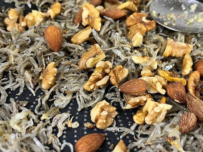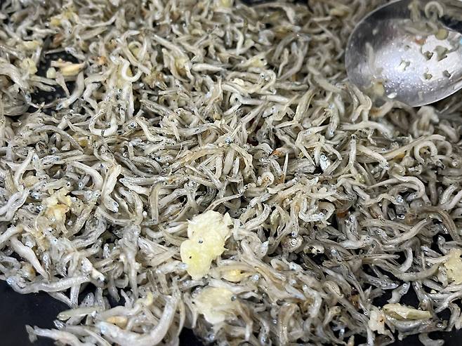 마늘 향이 올라오며 노릇하게 색이 변하기 시작하면 멸치를 넣고 같이 볶으세요. 멸치는 식용유에 충분히 볶아야 딱딱하지 않고 부드럽습니다.