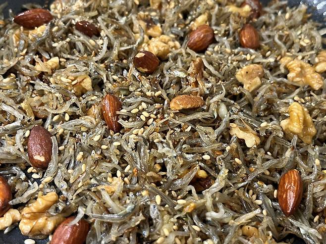 3분 정도 볶고 난 후 견과류를 넣어서 1~2분 더 볶아 주세요. 견과류도 약불에 볶아 내면 더욱 고소한 맛이 살아납니다.