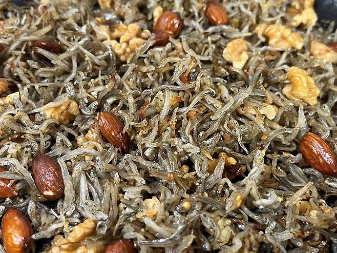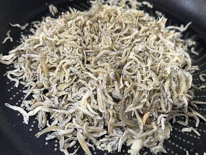 멸치는 볶기 전, 체에 밭쳐 잔 가루를 털어냅니다. 이 과정을 생략하면 볶는 도중에 멸치가 타거나 쓴맛이 날 수 있습니다.