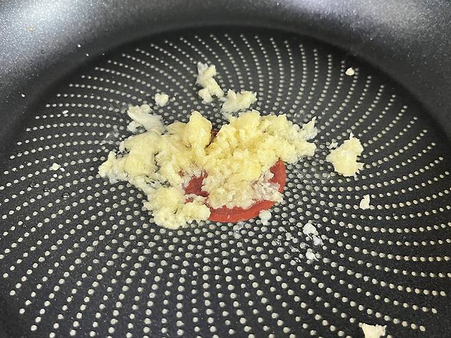 식용유 1스푼 두르고 다진 마늘 1스푼을 넣어 약불에 볶으세요. 마늘은 잘 타기 때문에 반드시 약불로 하여 볶습니다.