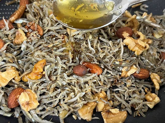 멸치는 원래도 짠맛이 있기 때문에 간장 등은 따로 넣지 않아도 돼요. 참기름 1.5스푼, 알룰로스 1스푼 넣습니다. 알룰로스 대신 올리고당, 물엿 등을 쓰셔도 됩니다.