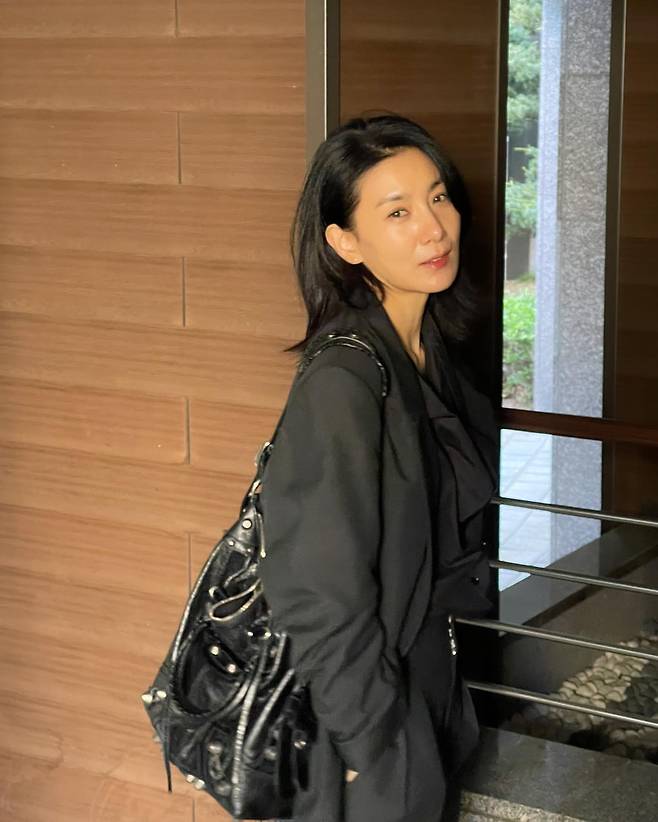 또 다른 사진 속에서는 올블랙 수트에 가죽 백으로 포인트를 줬습니다.