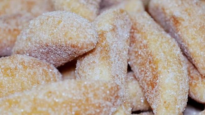 작고 납작한 반죽을 구운 뒤 설탕 시럽을 바르고 다시 설탕 가루를 묻히는 과정을 거친다. 설탕 범벅인 만큼 단맛이 강하지만, 겉은 바삭하고 속은 촉촉한 식감 덕분에 커피나 우유와 찰떡궁합이다.