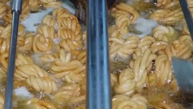 옛날 바나나 빵이 만들어지는 공장 옆에선 ‘옛날 꽈배기 빵’도 빼놓을 수 없다. 일반적인 튀김 꽈배기와 달리, 이 빵은 밀가루 반죽을 가늘게 뽑아 세 가닥을 손으로 꼬아 만든다.