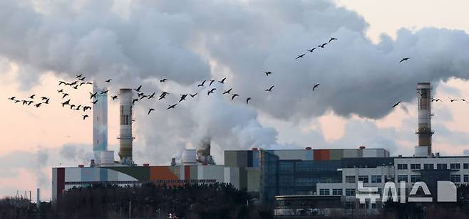 [인천=뉴시스] 전진환 기자 = 전국 대부분의 지역에 한파특보가 내려진 4일 오전 수증기를 내뿜는 인천 서구 서인천복합화력발전소 굴뚝 위로 기러기떼가 먹이를 찾아 날아가고 있다. 2025.02.04. amin2@newsis.com