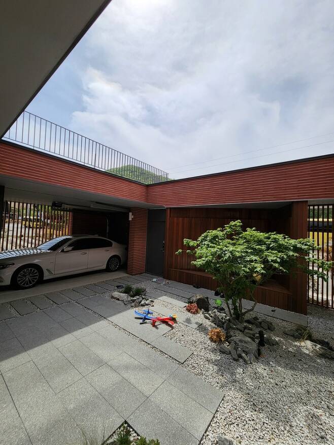 중정마당 옆으로는 주차 공간이에요. 차타고 내릴때 눈/비 맞는 걸 안 좋아해서 실내 차고가 있으면 좋겠다 싶어 요청드렸어요. 평수와 비용적인 문제로 설계사무소 측에서 고민을 많이 하시다가 결국 필로티 형식으로 설계하고 차고문을 제작하여 설치했습니다.