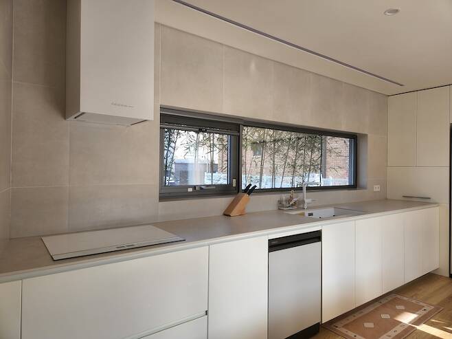 상부장은 애초부터 할 생각이 없었어요. 저의 작은 키도 한몫하지만, 주방이 크지않은 데다 상부장까지 하게 되면 답답해 보일 수 있겠더라고요. 600x600 사이즈의 타일을 사용했고, 창문도 크게내면서 앞에 대나무를 심어 인테리어 효과도 찰떡이에요.