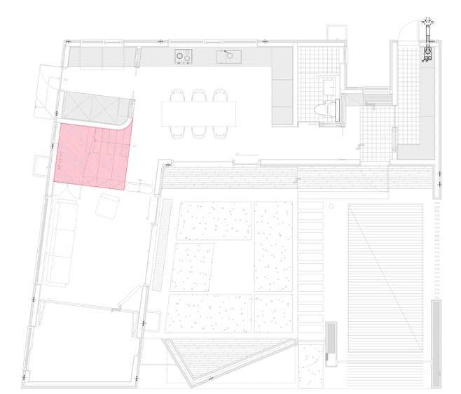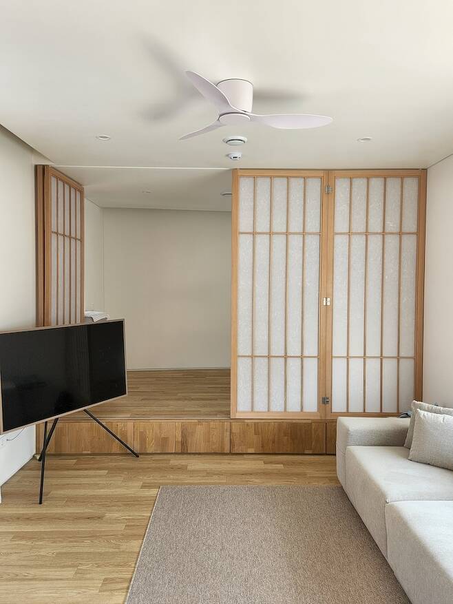 주방을 지나 계단&책장 옆으로 거실이 나옵니다. 거실에는 소파와 티비만 배치하고, 거실 옆으로는 평상이 있어요. 작은 방으로 별도 게스트룸을 마련할까 생각했으나 손님이 매일 오지 않는 이상 불필요한 공간일 수도 있겠다 싶더라고요. 버리는 공간 없이 평소에도 활용할 수 있었으면 해서 단차를 높여 시공했어요.