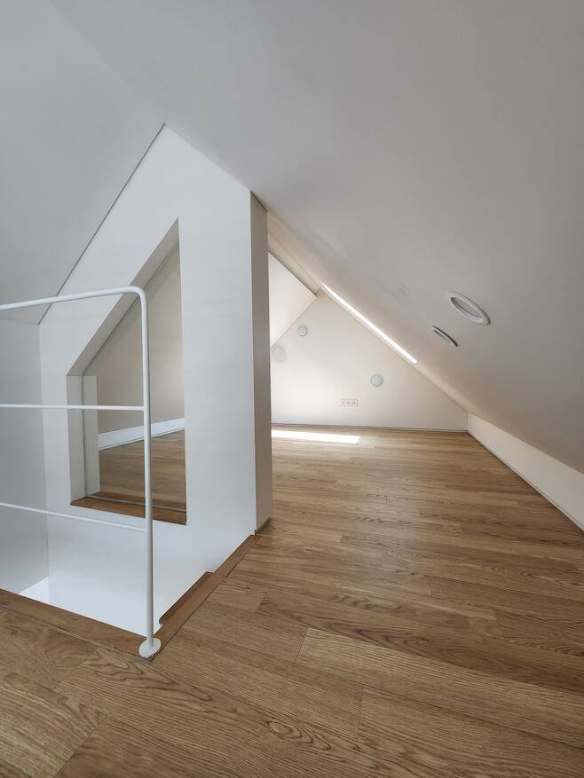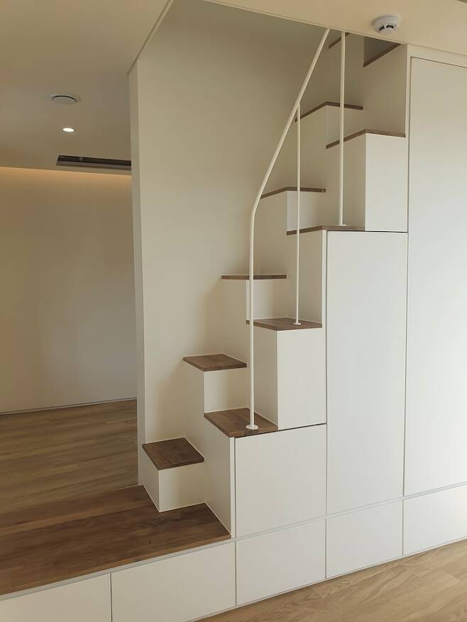 놀이방과 침실 사이에 다락 계단 가벽을 세웠어요. 복도 - 침실 - 놀이방 이 공간도 순환 구조로 설계했답니다.