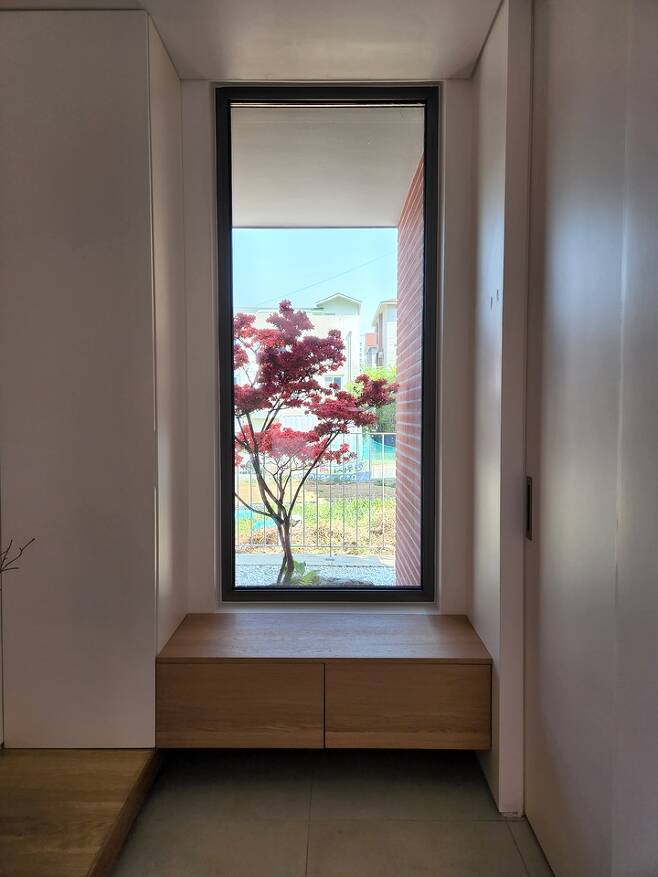 현관문을 열면 바로 보이는 현관 벤치에요. 아파트 살 때 아이가 항상 바닥에 앉아 신발 신는 게 불편해 보여 아이를 위해 하고 싶었던 거에요. 저도 가끔 앉아봅니다 ^^ 현관 입구 통창문 뒤로도 철쭉나무를 심었는데 지금 딱 절정이라 너무 예쁘네요.