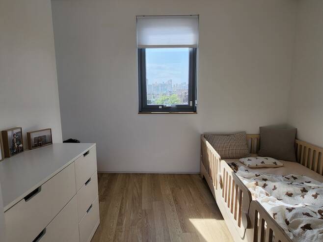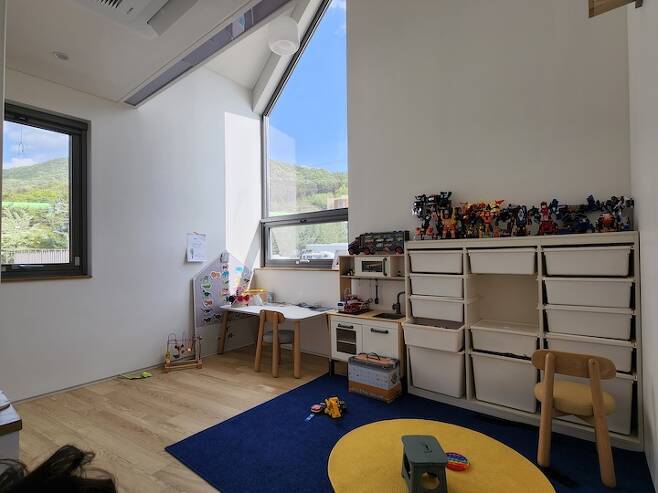 우리 집의 시그니처 통창을 가진 아이 놀이방이에요. 정남향으로 아이방 햇볕이 너무 좋아요! 항상 밝은 데서 지냈으면 하는 바람도 있었고, 통창의 멋을 그대로 두고 싶어 커튼 설치는 하지 않았어요.