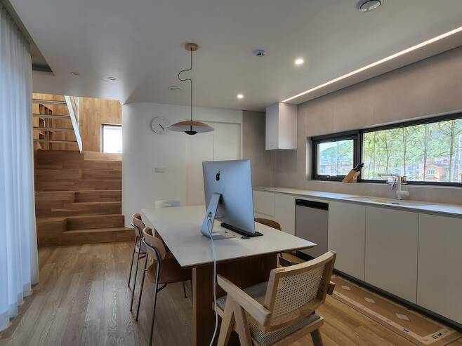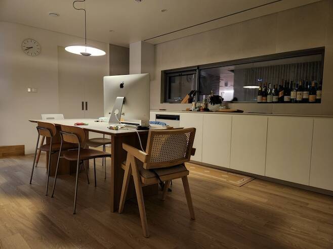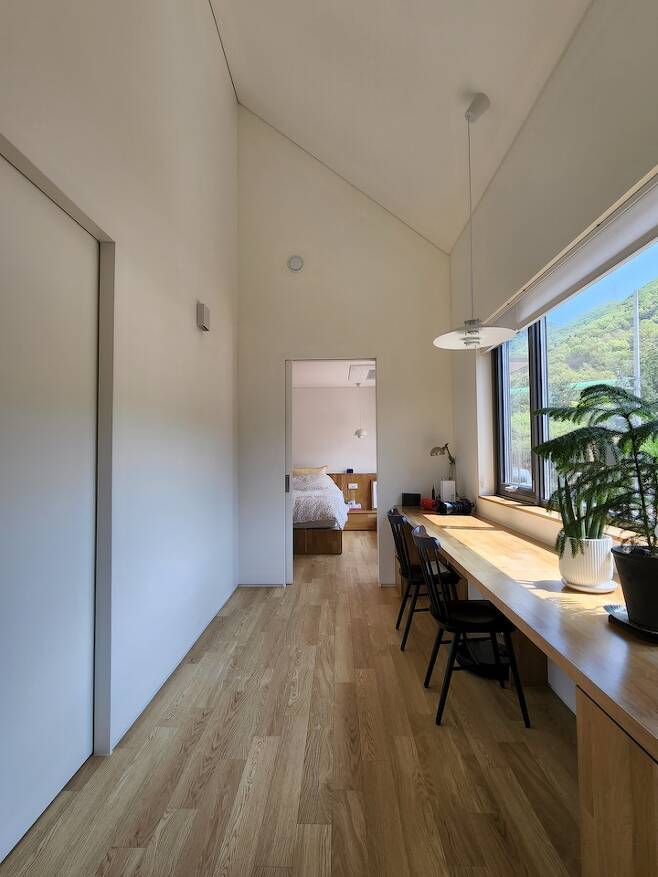 그리고 복도에 긴 책상을 제작해서 두었는데요, 아이와 셋이 앉기도 충분해서 좋아하는 공간 중 하나에요 :)