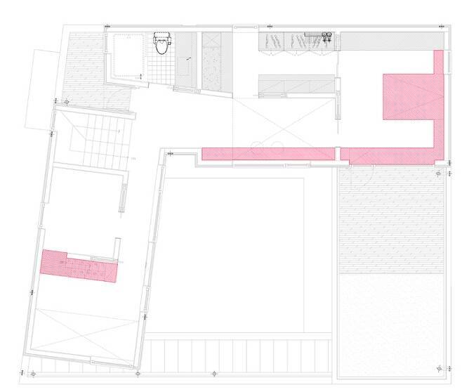 도면에 빨간색으로 체크되어 있는 부분은 현장에서 제작 및 시공해주신 가구 위치입니다. 1층은 거실 겸 게스트룸과 욕실, 주방, 다용도실이 있고 2층은 아이 방(놀이방/침대방)과 아이 놀이방 위 다락 공간이 있습니다. 그리고 가족 욕실 옆으로 드레스룸과 부부침실 사이 슬라이딩 도어를 달아서 복도 - 드레스룸 - 부부침실은 순환 구조로 만들었어요. 아래에서 사진과 함께 자세히 설명해 드릴게요. (설계는 유타건축사무소에서 맡아 주셨습니다.)