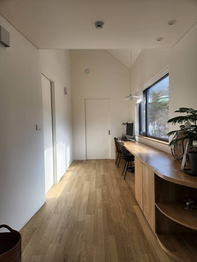 부부 침실 들어가기 전 2층 복도입니다. 우리 집 전체 바닥 마감재는 난방 효율이 좋은 강마루로 했어요! 강마루가 디자인이 다양해서 선택 폭이 넓었던 거 같고 실내 계단, 책상 등 제작가구와 최대한 비슷한 색감으로 골랐네요~ 대신 흠집이라고 해야하나, 찍힘 발생은 조금 있는 편이어서 이사할 때 조심조심! 했었어요.