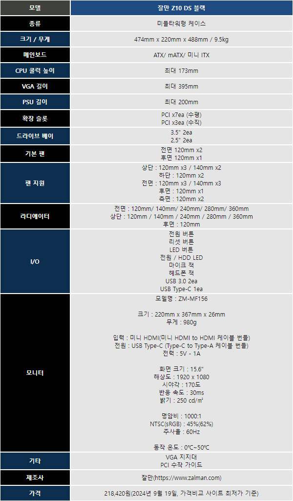 잘만의 새로운 케이스인 Z10 DS 블랙은 어항형 케이스는 아니지만 측면 강화 유리 패널로 케이스 내부를 쉽게 확인할 수 있으며, 전면 패널은 보조 모니터 역할을 하는 15.6" LCD 모니터와 냉각을 중시한 세로 라인 패널 중 선택해 쓸 수 있도록 선택권을 제공한다.