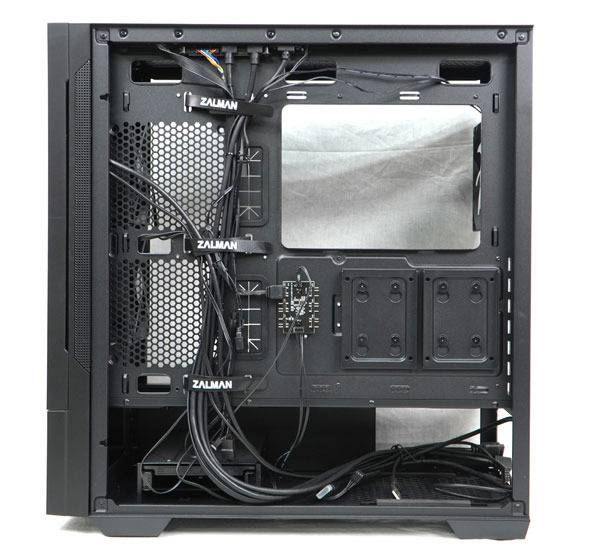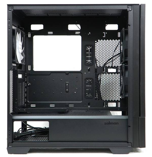 잘만 Z10 DS Black의 내부 공간은 최대 173mm 높이의 CPU 쿨러, 395mm 길이의 그래픽 카드와 미니 ITX부터 ATX까지의 메인보드 장착이 가능하며, 앞서 살펴본 측면 퉁풍구쪽으로 120mm 쿨링팬을 장착할 수 있는 넉넉한 공간을 제공한다.