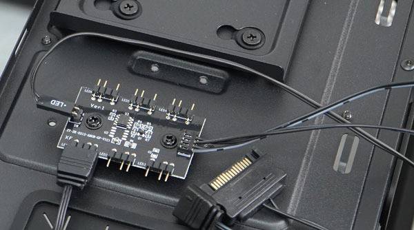 2.5" 브라켓 장착부 측면에는 앞서 언급한 ARGB LED 허브를 볼 수 있다. 총 여섯개의 ARGB LED 장치 연결이 가능하고, 상단에는 케이스 LED 버튼, 하단에는 메인보드나 다른 ARGB LED 허브 연결을 위한 커넥터가 연결된다. 다수의 ARGB LED 장치 연결 시 부족할 수 있는 전력 공급을 위해 SATA 전원 커넥터도 함께 제공된다.