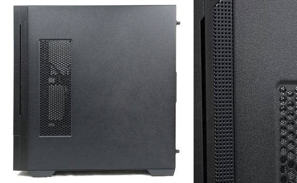강화 유리 패널 맞은편에는 흡기 혹은 배기로 사용할 수 있는 통풍구를 갖춘 철재 패널로 구성된다. 철제 패널에는 전면 패널로 LCD 디스플레이를 사용할 경우 부족해지는 전면 흡기 능력을 보충하기 위해 전면 패널 사이드 라인을 따라 직선형의 통풍구를 만들어 놨다.