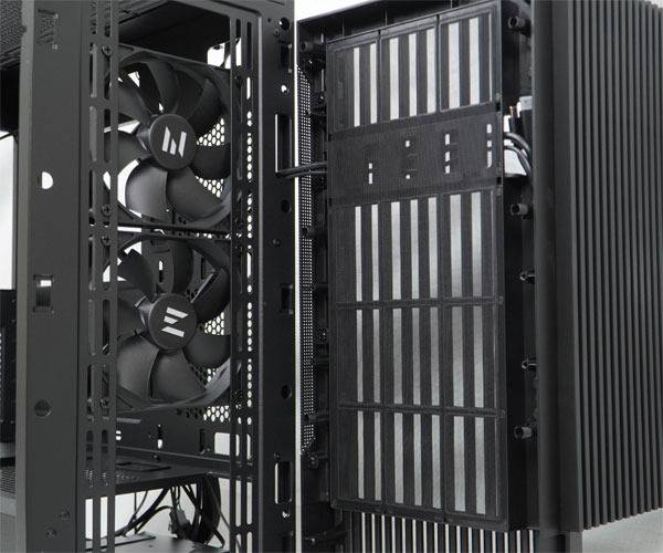 잘만 Z10 DS Black의 전면 패널은 120mm 쿨링팬 2개가 기본 제공된다. 전면 패널의 내부 프레임에는 먼지 필터를 더해 먼지 유입을 방지하고, LCD 패널을 사용해도 측면 패널쪽으로 회전 시키면 세로 디자인의 모던 패널 수준의 외부 공기 흡기가 가능하다.