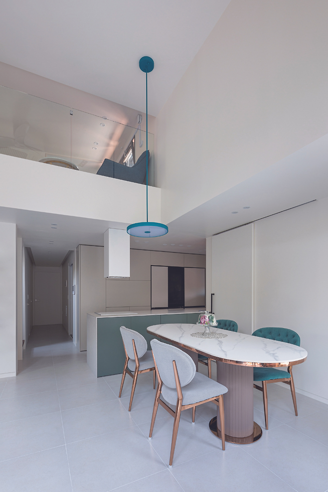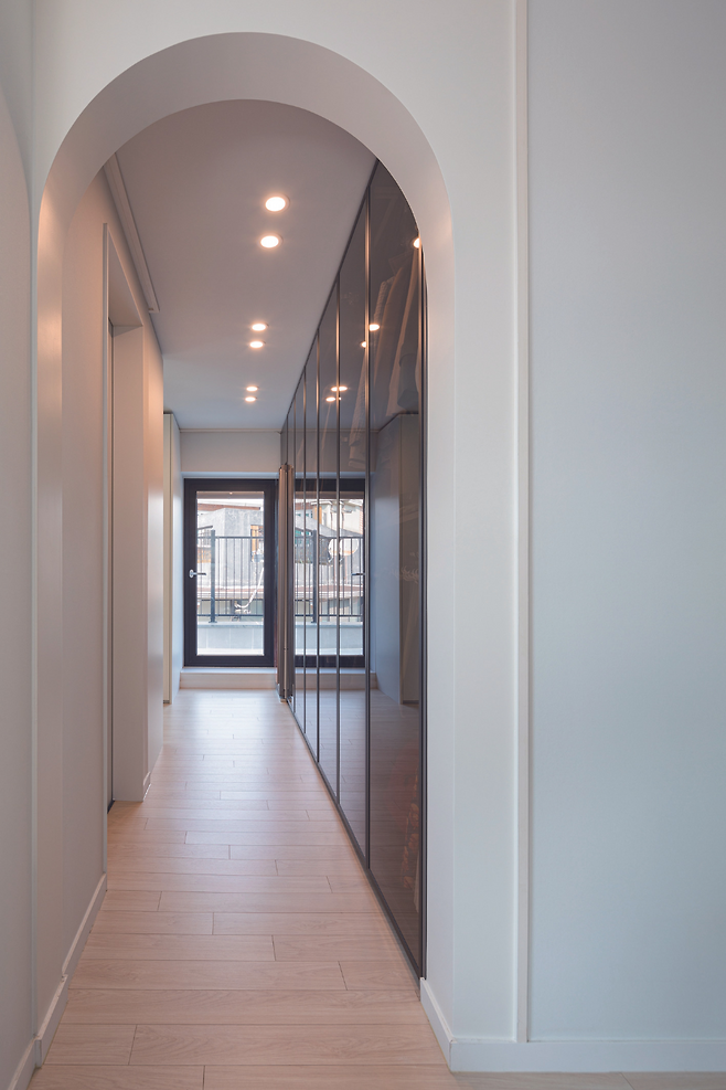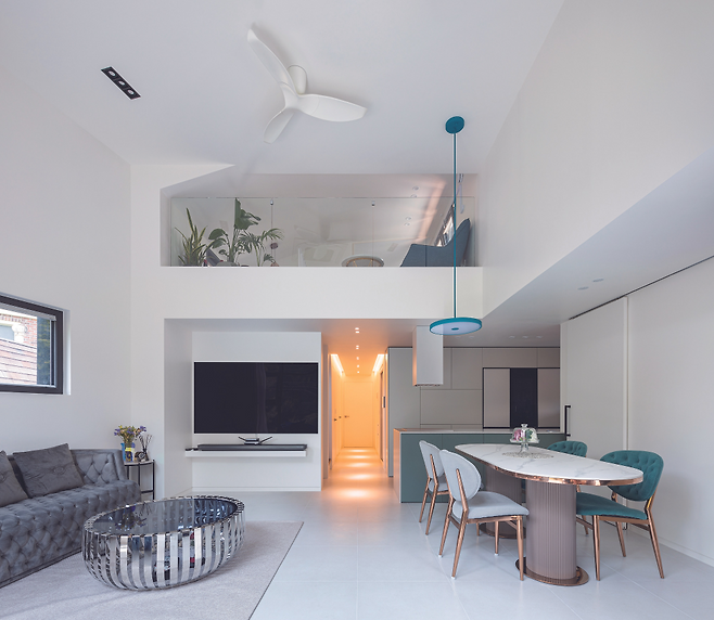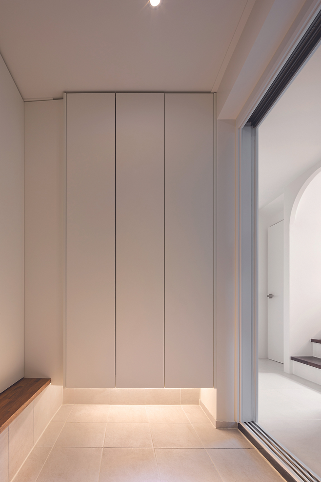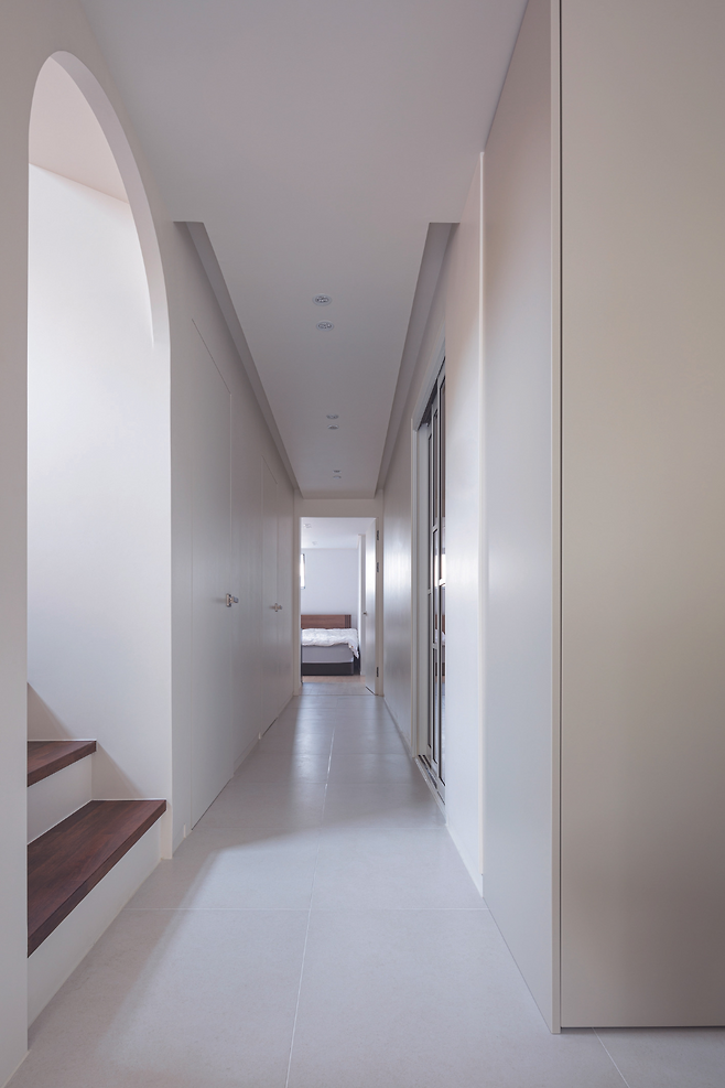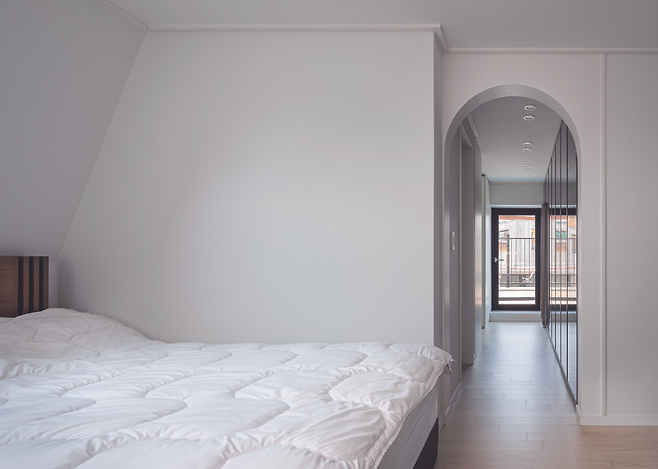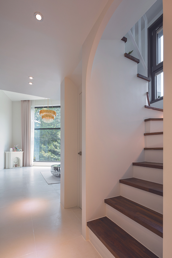 현관에 들어서면 복도와 마주하게 되고, 이어 다락으로 올라가는 계단을 만나게 된다. 복도를 따라 공용 공간과 개인 공간을 분리하는 레이아웃을 적용했다. 공원 변으로 탁 트인 시야를 가진 거실은 주방과 연계시켜 공용 공간으로서의 기능과 동시에 휴식 공간이 되도록 구성했다. 침실은 프라이버시를 고려해 분리 배치했다.