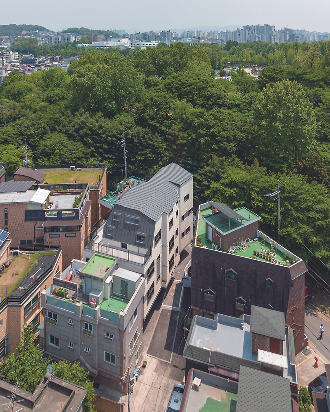 건물 1층은 소규모 상가와 주차장, 2~3층은 3룸 2가구와 원룸 1가구씩으로 구성해 임대수익을 올릴 수 있도록 고려했다. 4층은 다락과 연계해 공원 변으로 복층의 오픈 뷰를 감상할 수 있도록 커튼월 형식의 큰 창으로 계획했다. 창밖으로 보이는 풍경은 한 폭의 그림 같은 공원의 사계절을 담는다. 큰 창과 테라스를 통해 대공원의 사계절을 느끼며, 각각의 기능을 갖는 테라스와 외부 공간 활용으로 주택에서의 삶을 소소하고 행복한 일상으로 채워 가고 있다.