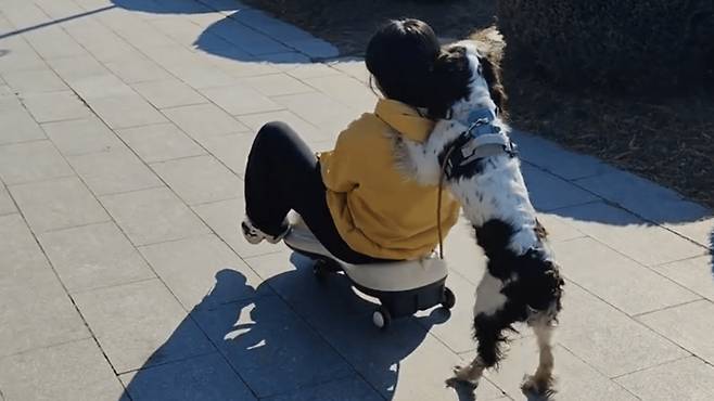 꼬마 자동차에 탄 주인과 등을 밀어주는 강아지의 모습이 재미있는 추억을 만들어준 것 같습니다!