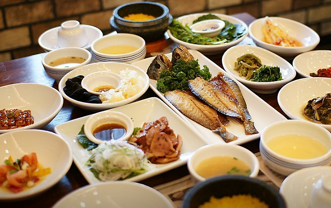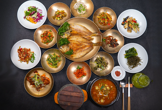 구성: 해물모둠장, 보리굴비, 양념게장, 직화불고기, 청국장, 돌솥밥 등