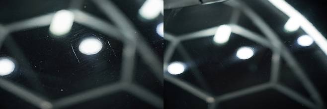 먼저 작업용 어플리케이터에 ‘오토그루밍 매직 크림’을 소량 덜어낸 다음, 흠집이 있는 부위에 약 1~2분 정도 누르며 발라준다. 그 다음, 마른 극세사 타월을 이용해 작업부위를 닦아주면 자잘한 도장면 스크래치는 대부분 말끔히 지울 수 있다. 특히 자동세차만 고수해온 어두운 색 계열 차의 경우, 작업효과를 크게 느낄 수 있다.