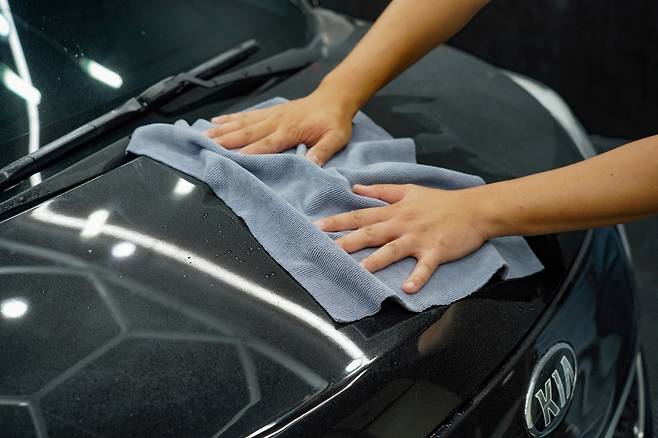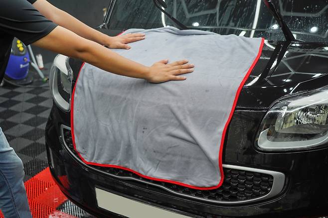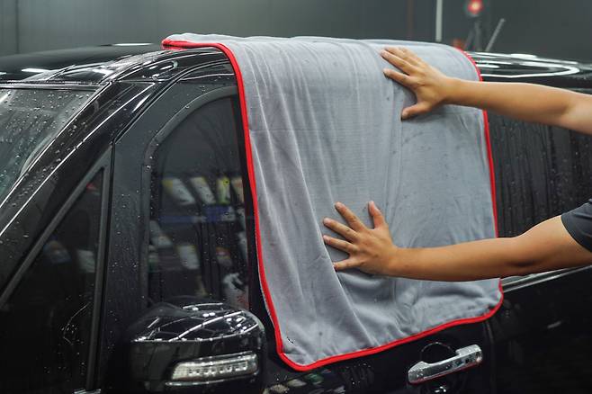 거품을 모두 제거했다면, 이제 도장면의 물기를 없앨 차례. 건조용 드라잉 타월은 면적이 큰 제품을 이용하는 게 작업시간도 빠르고 효과적이다. 이때, 샤워 후 물기를 제거할 때처럼 타월을 바로 쓸어내리지 않고, 도장면 위에 얹어놓고 타월이 스스로 물기를 머금는 방법으로 드라잉을 하는 게 좋다. 마른 타월로 인해 도장면에 스크래치가 발생할 수 있기 때문이다. 타월이 충분히 젖은 상태에서는 가벼운 힘으로 닦아내도 좋다.