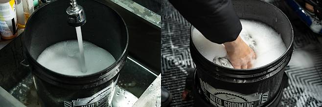 카샴푸 역시 폼건을 통해 간편하게 분사할 수 있다(세차장 내 개인용품 사용 가능한지 확인 필요). 먼저 카샴푸와 물을 적절한 비율로 섞은 뒤, 고압수 건에 연결해 도장면 위에 고르게 분사한다. 세차용 버킷을 이용하는 방법도 있다. 18L 버킷을 기준으로, 카샴푸 2 뚜껑 정도가 적당한 비율이다. 우선 물을 절반 정도 채운 뒤, 그 다음 고압수를 이용해 거품을 풍성하게 만드는 게 좋다.