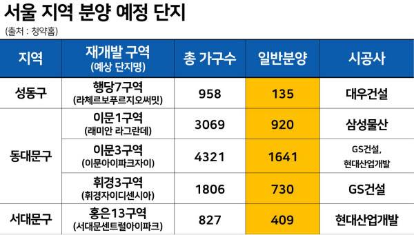 현재 서울에서 일반분양을 앞둔 단지로는 동대문구 이문 1구역(래미안 라그란데.3069가구) ·3구역(이문아이파크자이.4321가구), 성동구 행당7구역(라체르보 푸르지오 써밋.958가구), 서대문구 홍은13구역(서대문센트럴아이파크.827가구) 등이 있다. 이들 단지는 올해 상반기부터 일반분양을 고민했지만, 시장 상황이 급격히 침체되면서 시기를 조율해 왔다.