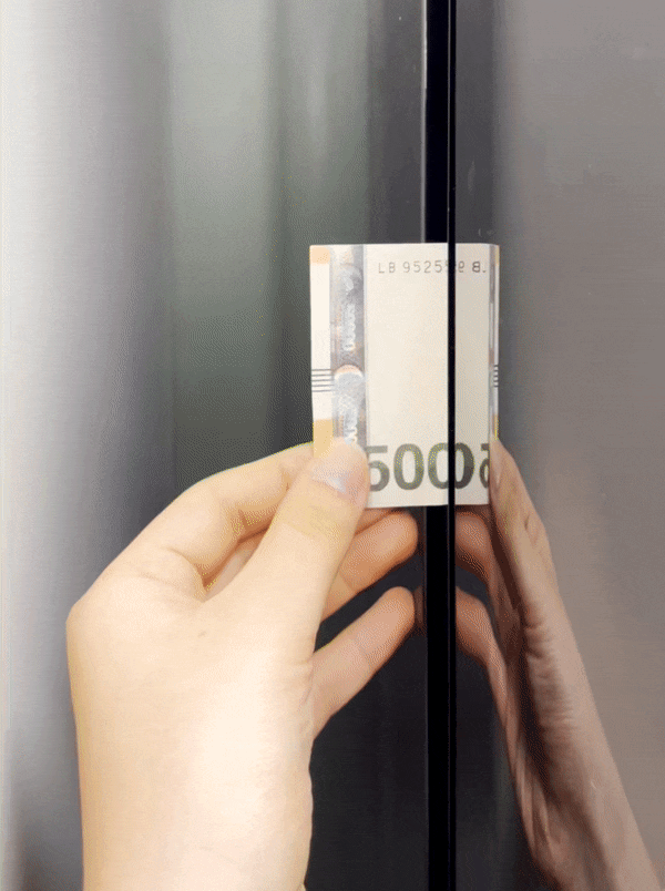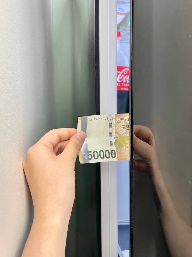 먼저 냉장실, 냉동실의 문을 열고 지폐를 한 장 끼운 채 그대로 닫아 주세요.