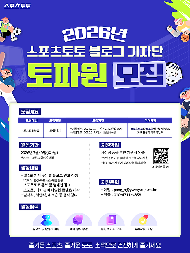 최종 합격자는 2026년 3월부터 9월까지 활동하며, ▲발대식 ▲해단식 ▲교육 ▲워크샵 ▲간담회 등 필수 일정에 참여해야 한다. 3월26일(목) 개막하는 ‘2026 서울국제스포츠레저산업전(SPOEX 2026)’을 비롯해 북중미 월드컵 응원전, 사회공헌프로그램 등 스포츠토토의 주요 행사와 공익 및 건전화 캠페인 활동에 함께할 수 있다.