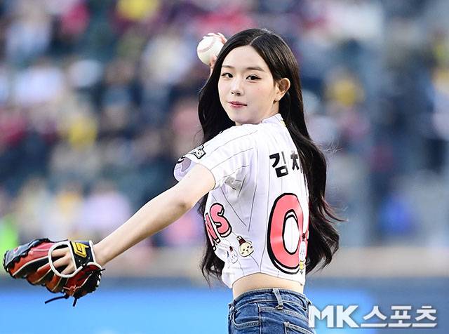 경기에 앞서 걸그룹 트리플에스 김채연이 시구를 하고 있다.