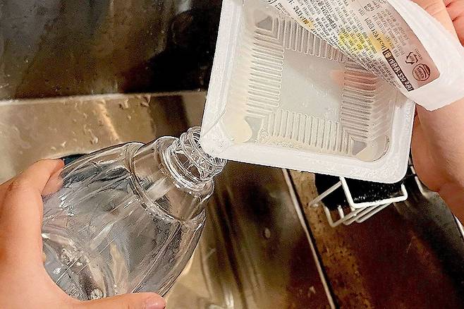 먼저 주방세제로 설거지를 하기 전 치킨무 국물을 꼼꼼하게 컵에 뿌려주는데요. 그 뒤 세제와 물로 깨끗하게 헹궈주면 비린내 제거는 물론 살균효과까지 볼 수 있답니다.