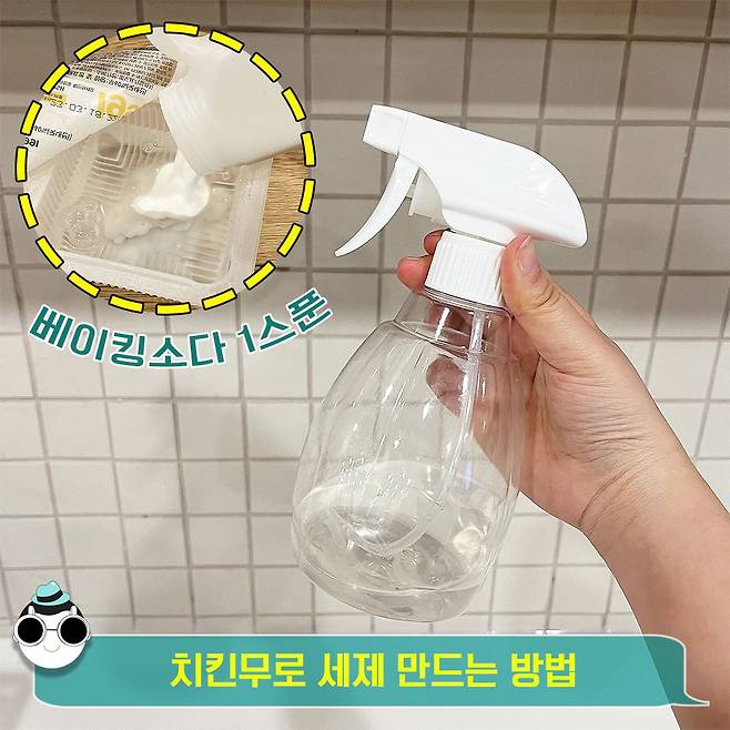 세제 만드는 방법은 초간단! 치킨무 국물에 베이킹소다 1스푼을 섞어주시면 끝입니다. 이제 이 친구를 다양한 곳에 활용해볼게요~?