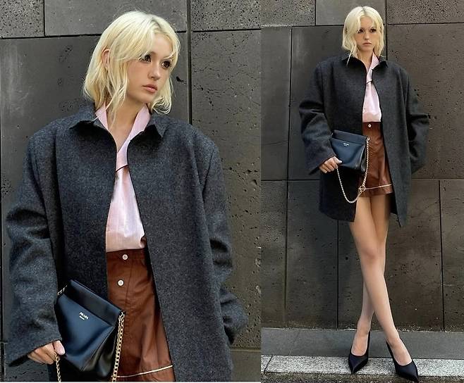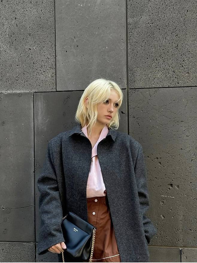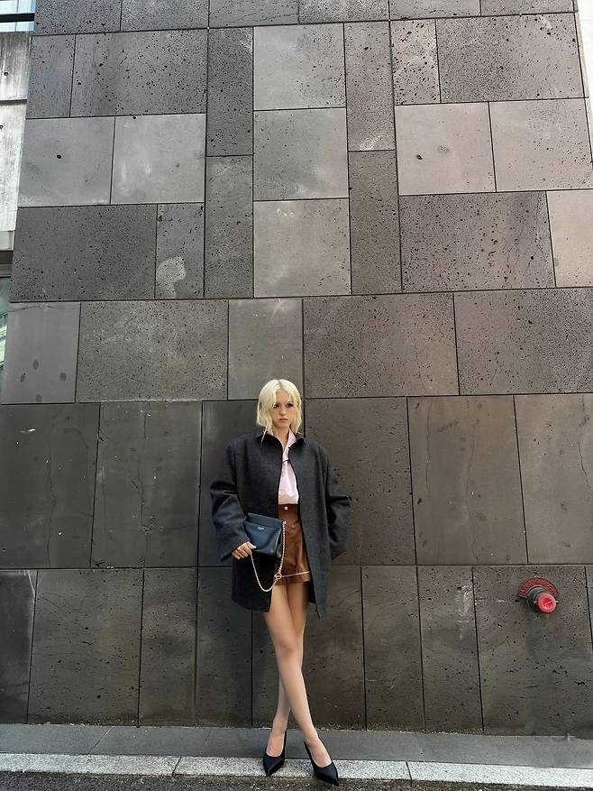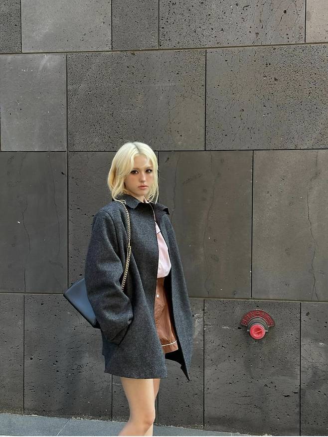 전소미는 오버사이즈 차콜 그레이 코트를 통해 도회적이고 무심한 실루엣을 연출했습니다.