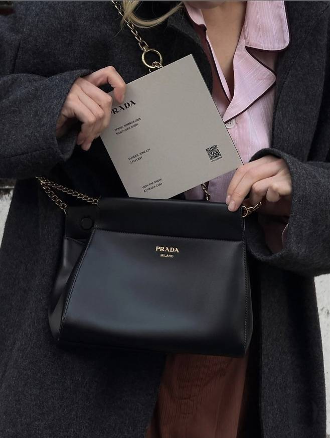 프라다 블랙 미니백과 골드 체인은 룩에 클래식함과 은은한 화려함을 더했습니다.