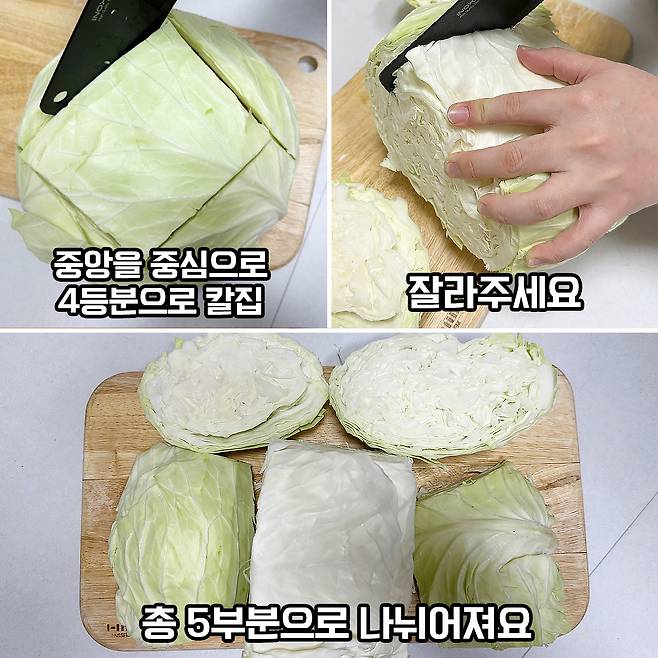 바로 앞 단계에서 겉잎을 제거했다면 이제 이 상태에서 양 옆 4부분을 잘라주세요.