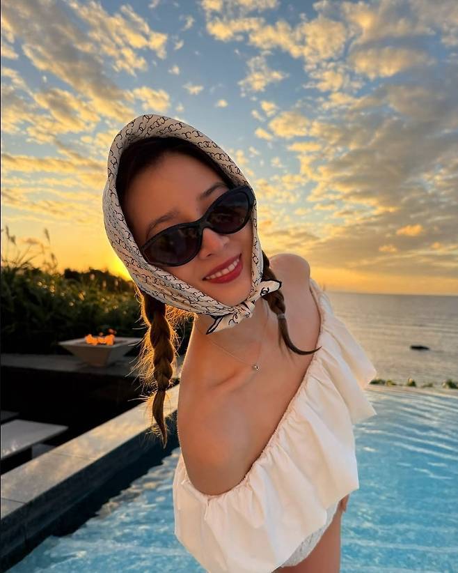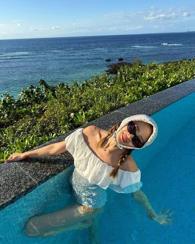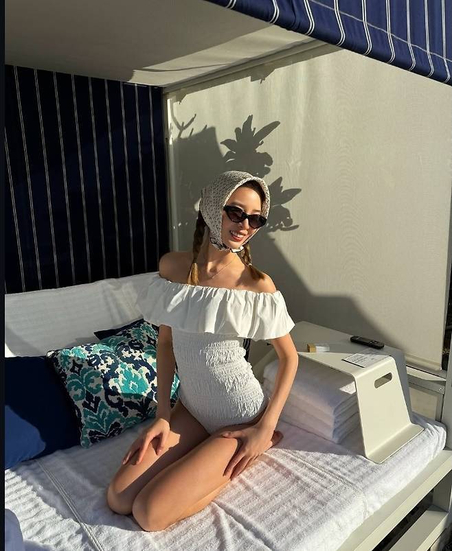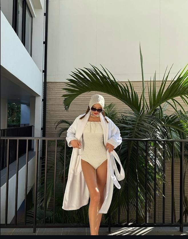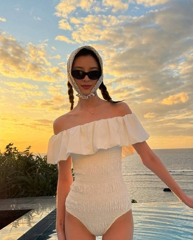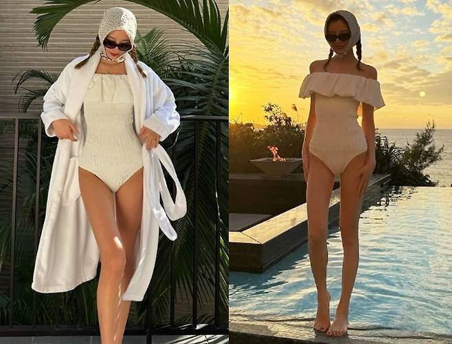 아이린은 어깨를 드러낸 순백의 오프숄더 수영복과 가운을 걸쳐 우아하면서도 사랑스러운 매력을 뽐냈습니다.